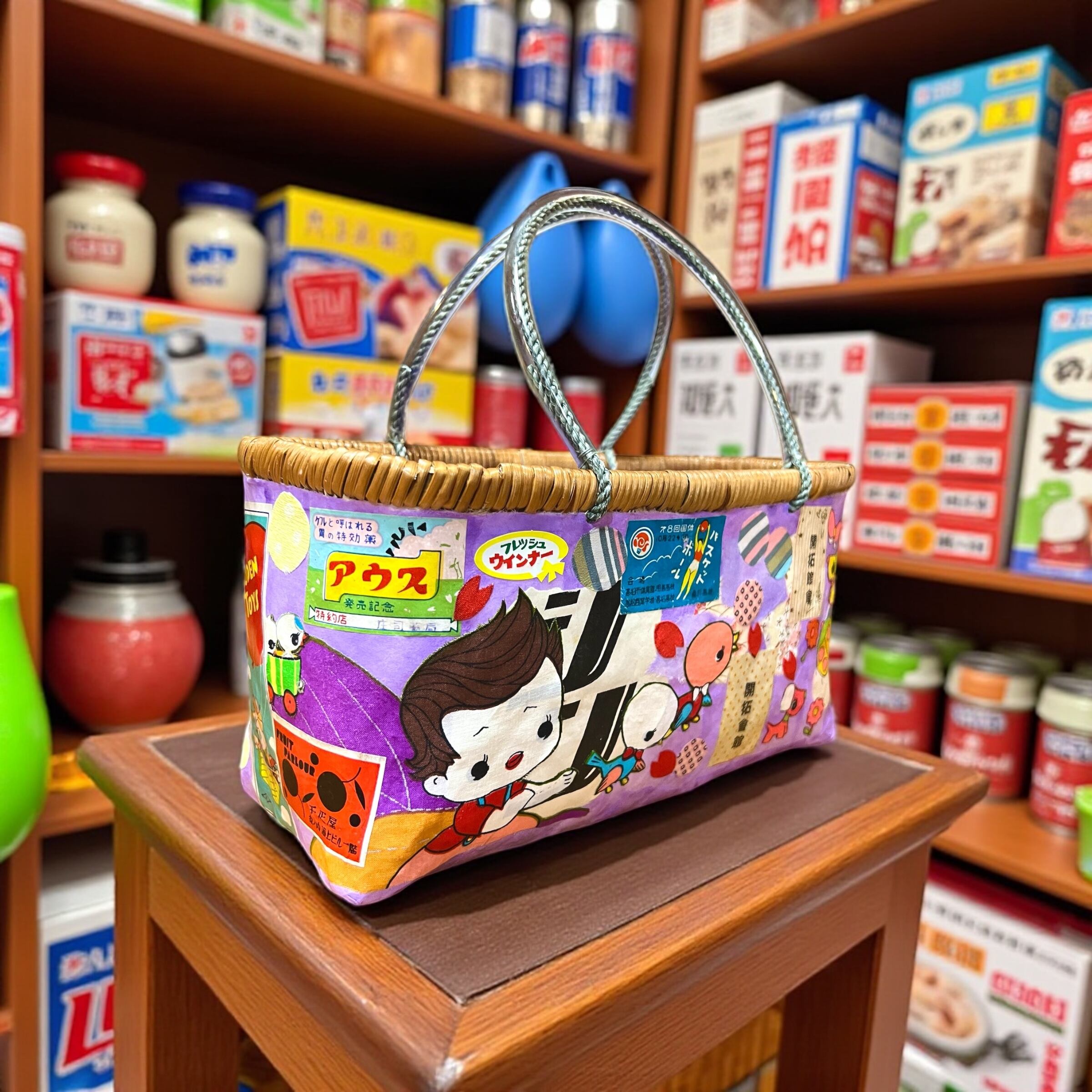 A one-of-a-kind upcycled basket bag crafted with antique kimono fabric and retro Showa-era vintage labels.