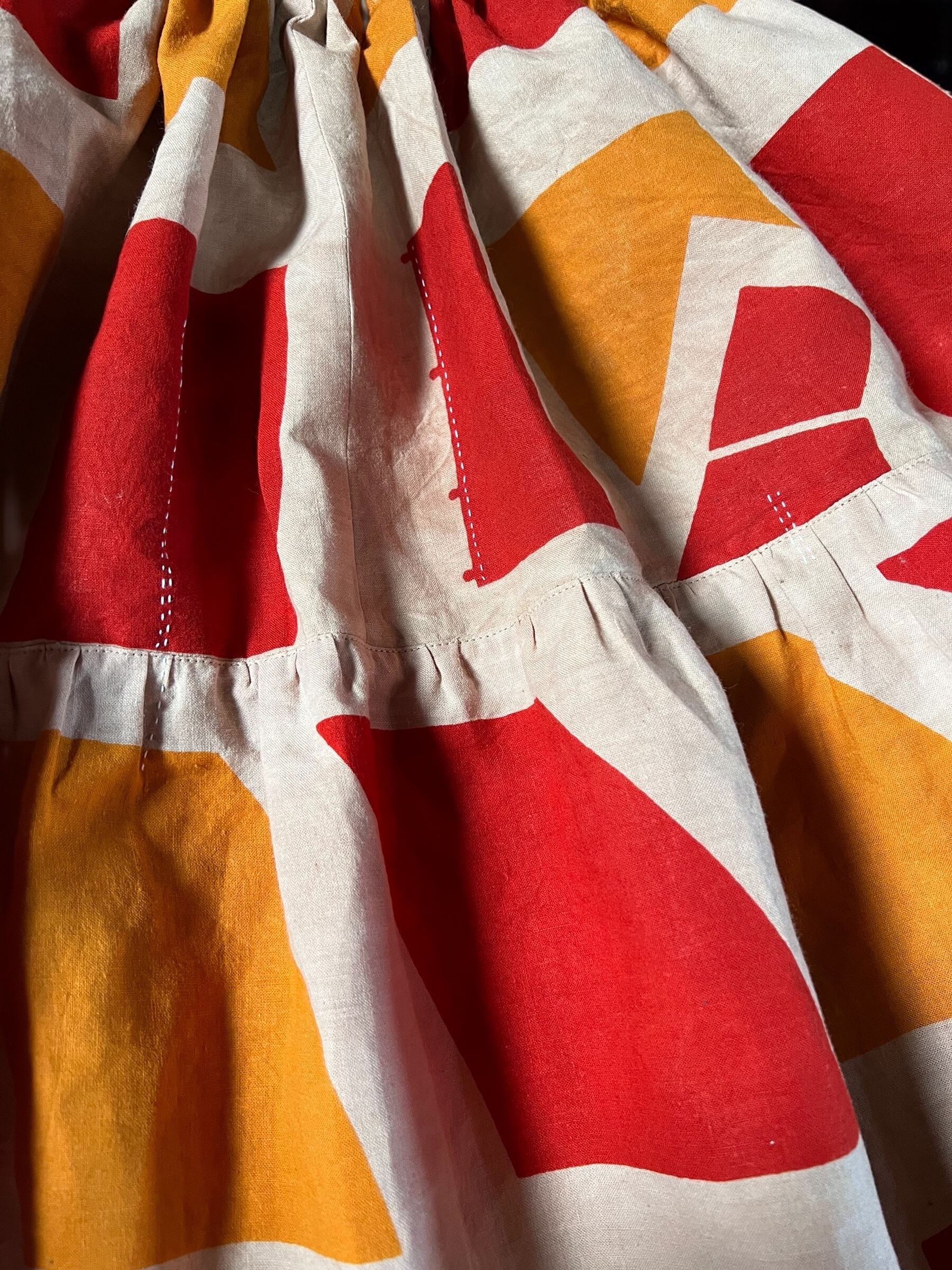 昭和レトロ(1926–1989)の銭湯♨️の“のれん”をアップサイクルし、ロングティアードスカートに仕立てました。